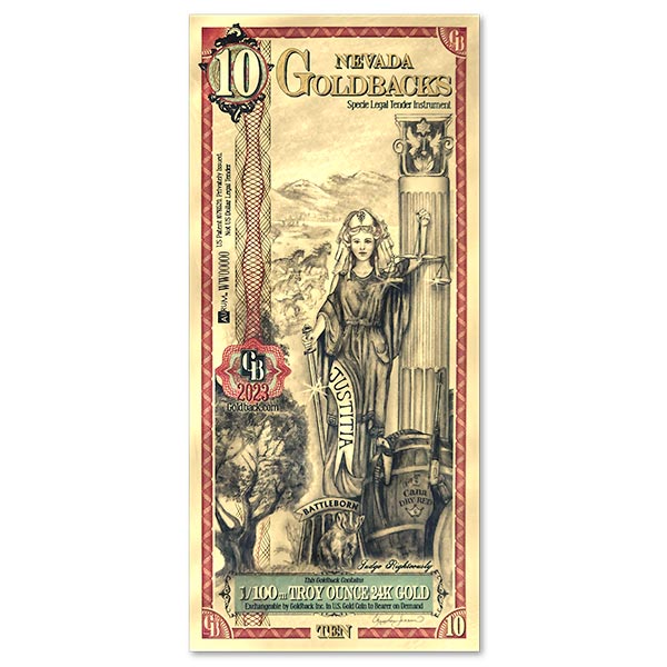 The 10 Goldback is a denomination of voluntary, spendable 24-karat gold currency, introduced in 2019 to facilitate small, everyday transactions. Each note contains 1/100 troy oz (0.01 oz) of .9999 fine gold, with designs honoring local state virtues. They are not U.S. legal tender but are accepted by some vendors. Designs our choice.