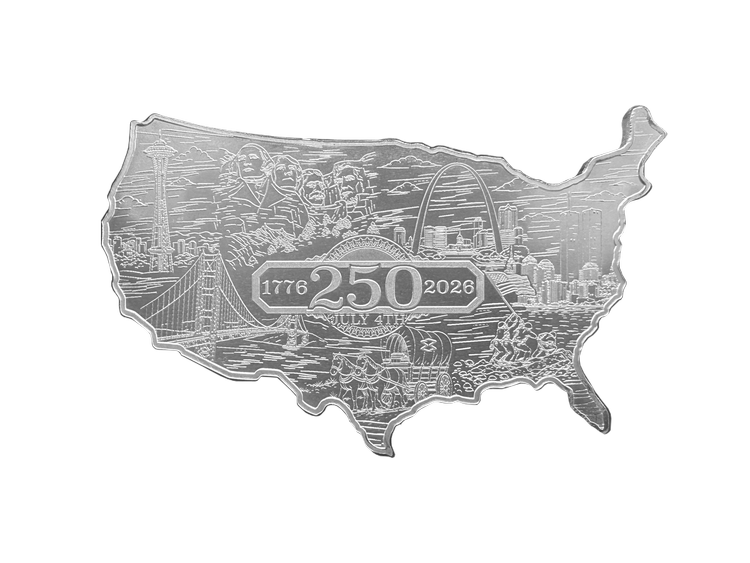 Elemetal’s USA 250th Anniversary 5oz Silver bar is a limited edition product, with mintage exclusively during 2026, the 250th anniversary of the United States.. The 5 oz bar is shaped to match the contiguous United States and features an artistic layout honoring iconic landmarks, heroic moments, and symbols of American resilience. Minted in .999 fine silver, this bar continues Elemetal’s approach to detailed craftsmanship and visually rich bullion design. With imagery representing both the nation’s past and its enduring spirit, this commemorative edition celebrates the upcoming 250th anniversary of American independence through thoughtful sculpting, layered symbolism, and powerful nationwide themes.