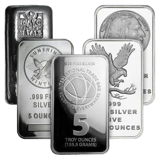 5 oz Generic/Secondary Silver Bar or Round in .999 fine silver, offering verified quality and affordability for cost-conscious silver investors. Varying conditions and designs.